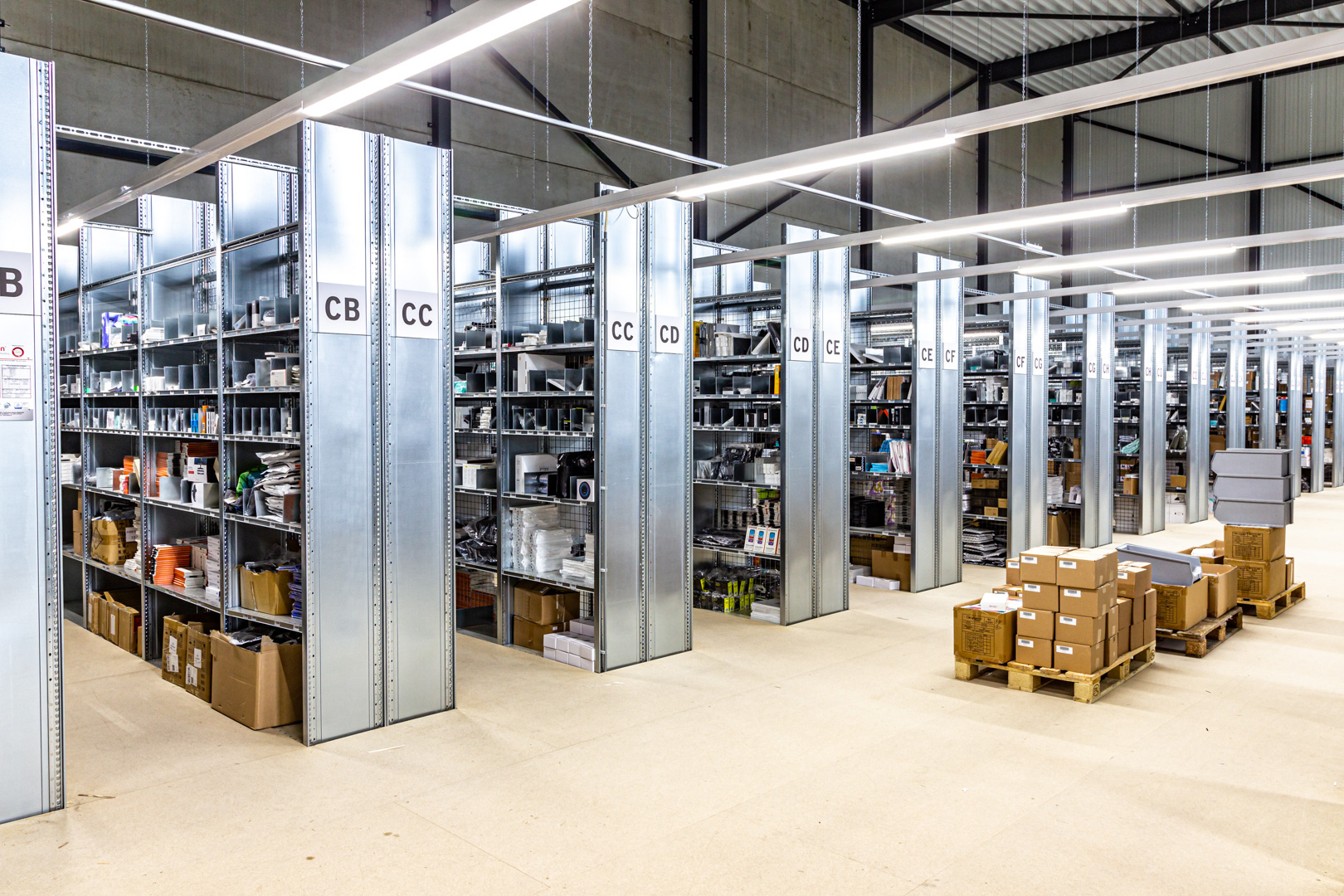 Bij de bouw van het nieuwe pand van Gamp is gekozen voor de Linea Serie lichtlijnen. Meer dan 1 kilometer aan Linea Serie armaturen is op maat geproduceerd om een optimale lichtkwaliteit te garanderen. In de hoge magazijnhallen zorgen armaturen met 30 graden optieken voor nauwkeurige verlichting, terwijl verschillende armaturen zijn voorzien van noodverlichting om een veilige evacuatie bij stroomuitval mogelijk te maken.